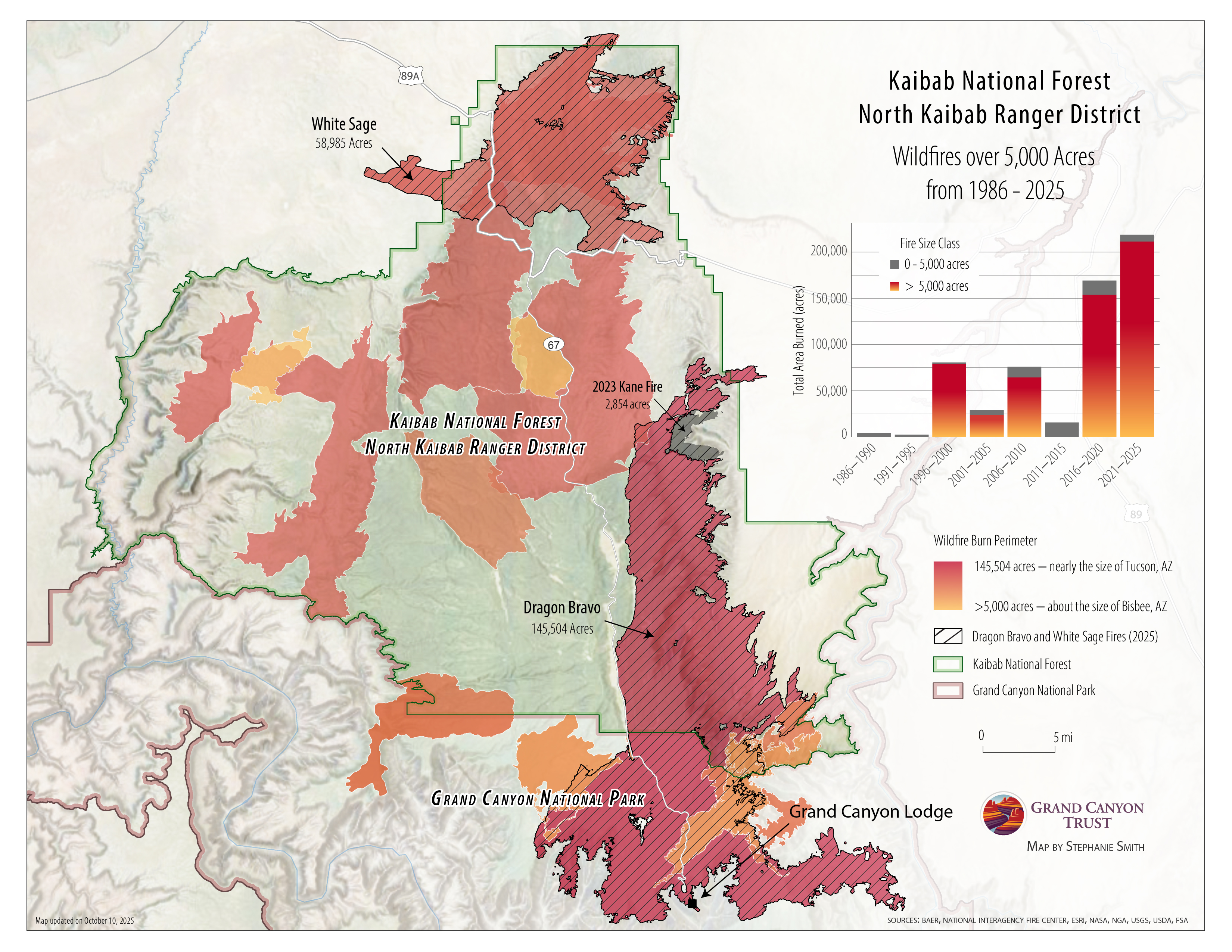 Fire is part of the landscape on the north rim of the Grand Canyon. This map shows where wildfires over 5,000 acres have burned on the north rim between 1986 and 2025.