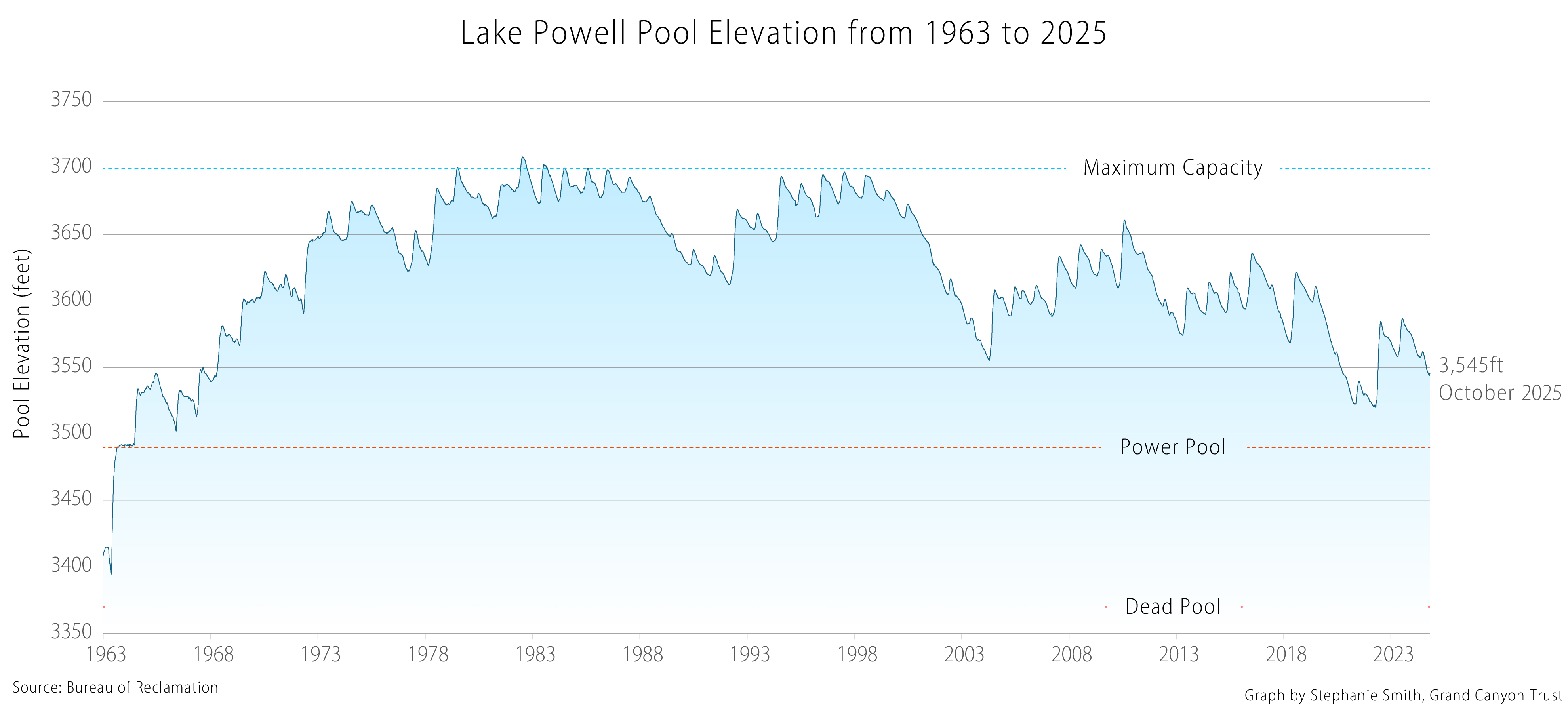 Lake Powell reached its full capacity for the first time in 1980, 17 years after the completion of Glen Canyon Dam. Since 2000, shrinking snowpacks, rising temperatures, thirsty crops, and growing populations have strained the Colorado River and its reservoirs Lake Powell and Lake Mead. See the graph below.